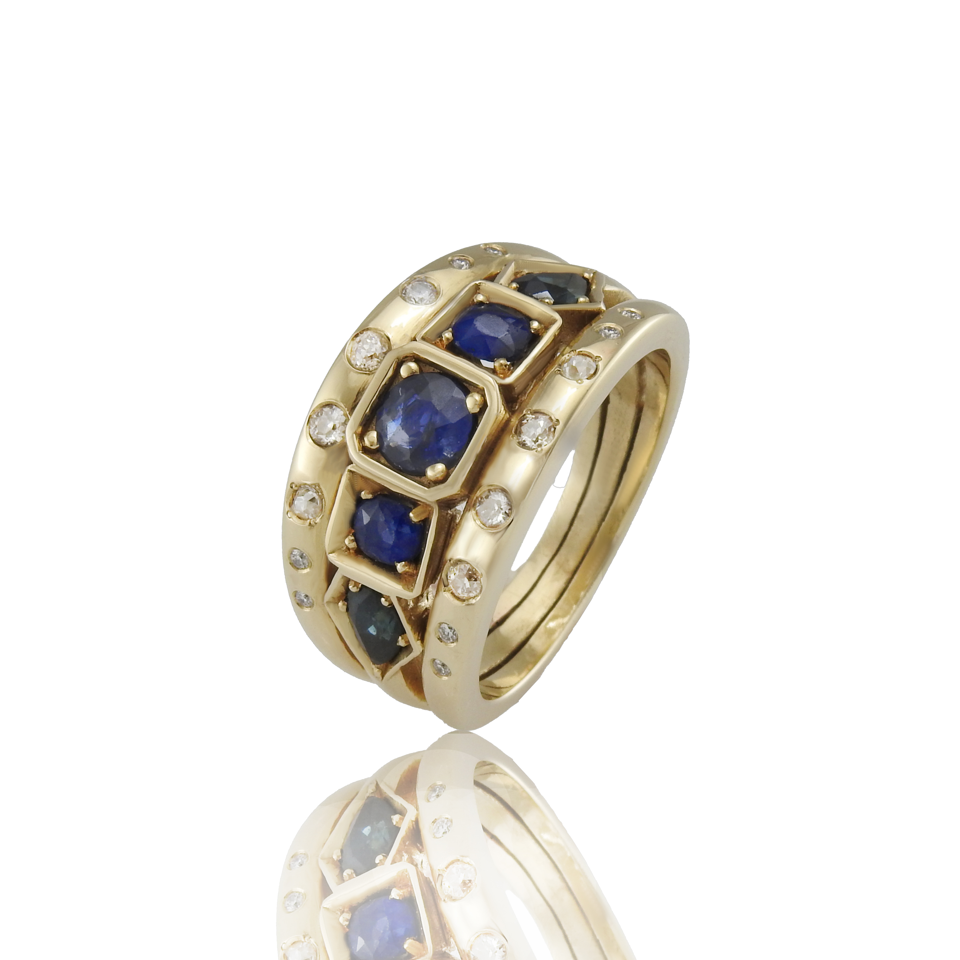 The original ring was delicate and sentimental: three blue sapphires and eight small diamonds set in 18ct yellow gold. After the passing of her husband, Lynette wanted a piece that represented the next stage of her life; something beautiful, wearable, and uniquely hers, without feeling like a traditional engagement ring.